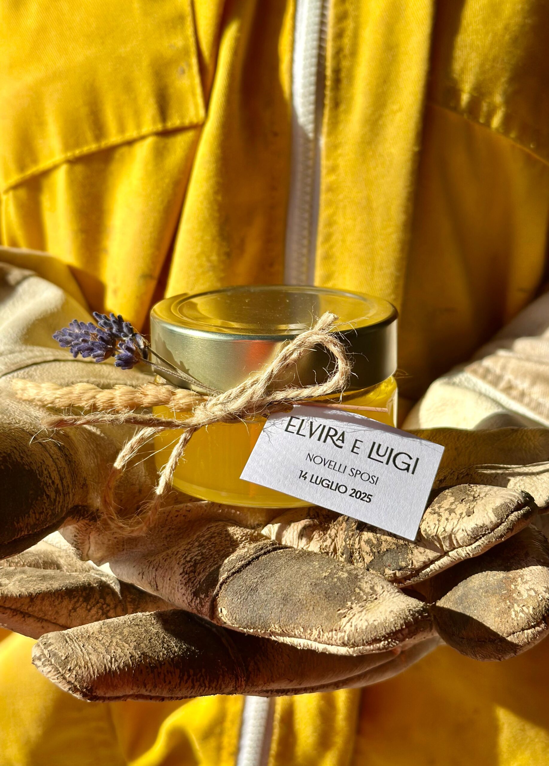 In questa versione avrete una bellissima bomboniera con miele ed etichetta personalizzabile con nomi, cerimonie e date a piacimento.